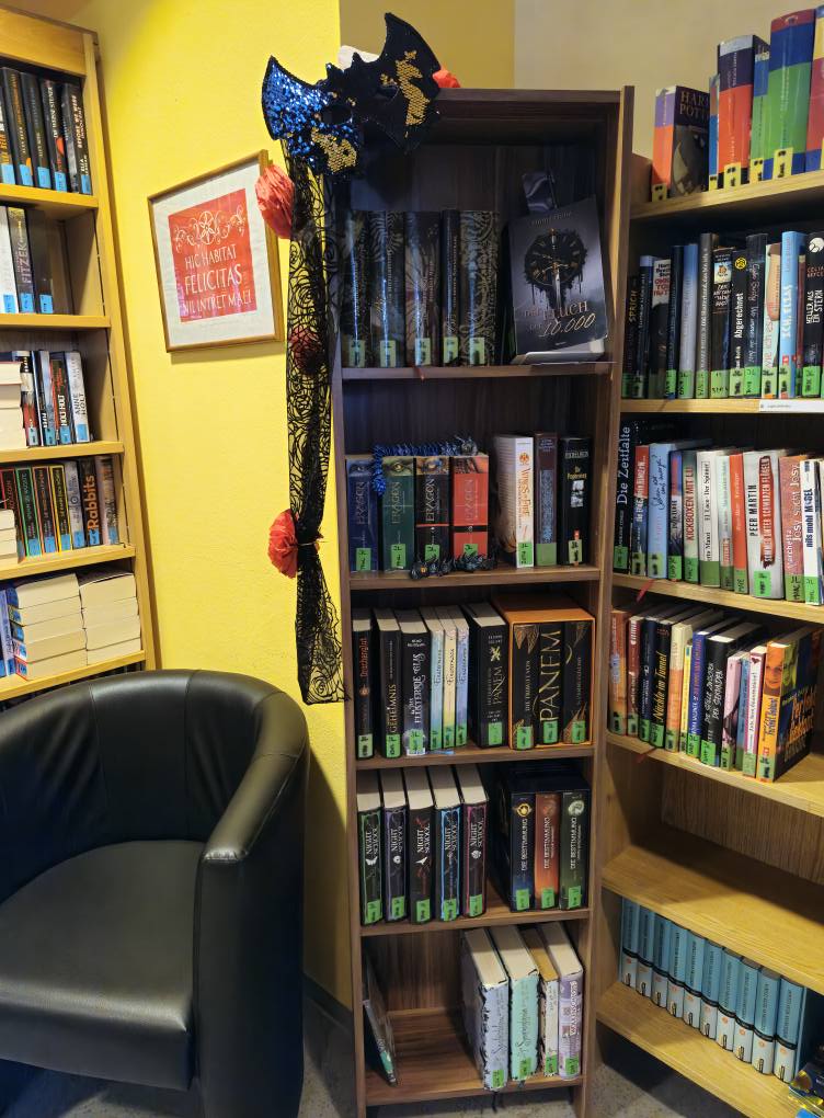 Inspiriert vom fantastischen Debütroman „Der Fluch der 10.000“ unserer jungen Autorin Emma Kranz haben wir ein neues Highlight für euch geschaffen: Unseren brandneuen Fantasy-Ständer! Er ist liebevoll dekoriert – eine kleine magische Ecke voller Abenteuer, Drachen, HeldInnen und Geheimnisse. Die Auswahl besteht aus beliebten Fantasy-Titeln aus unserem Bestand und frisch angekauften Neuheiten. Ein großes Dankeschön an unsere engagierte Mitarbeiterin für die wunderschöne Gestaltung!